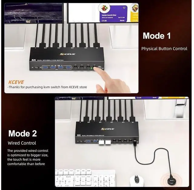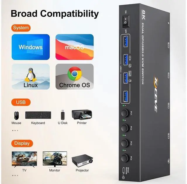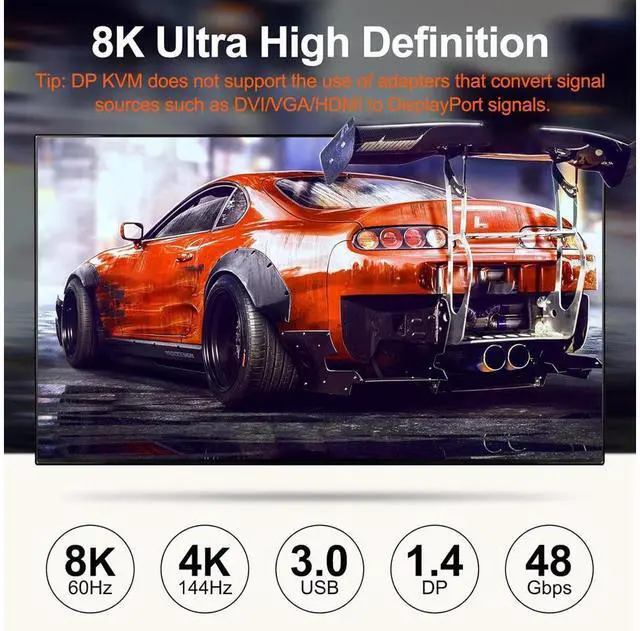 • [Ultra HD 8K@30Hz] Support resolution 4K@144Hz 8K@30Hz. this KVM aslo support input terminal to connect 4 computers with different resolutions, e.g. one is 4K@60Hz, the other is 4K@30Hz, 1440P@60Hz.