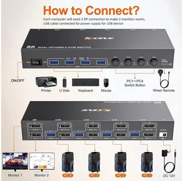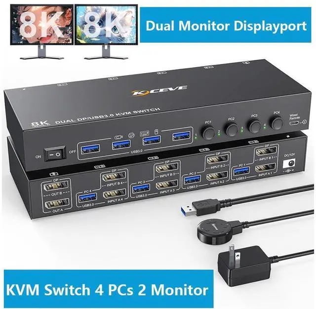 8K@30Hz Displayport KVM Switch 4 in 2 Out, Dual Monitors Displayport USB 3.0 KVM Switcher for 4 Computers Share 2 Monitors, Keyboard and Mouse, Wired Remote and USB Cables Included eokCXOY