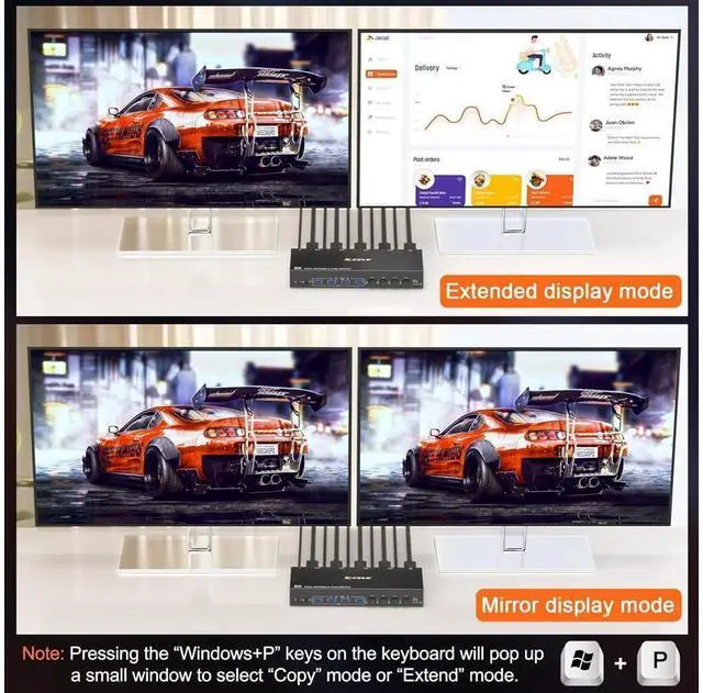 • [DP KVM Switch 4 PC 2 Monitors] This is a perfect KVM switch for DP ports device to share keyboard mouse and monitor. In copy mode the main screen can be copied to the second output screen. In extend mode, the window from the main screen can be dragged to the second output screen.