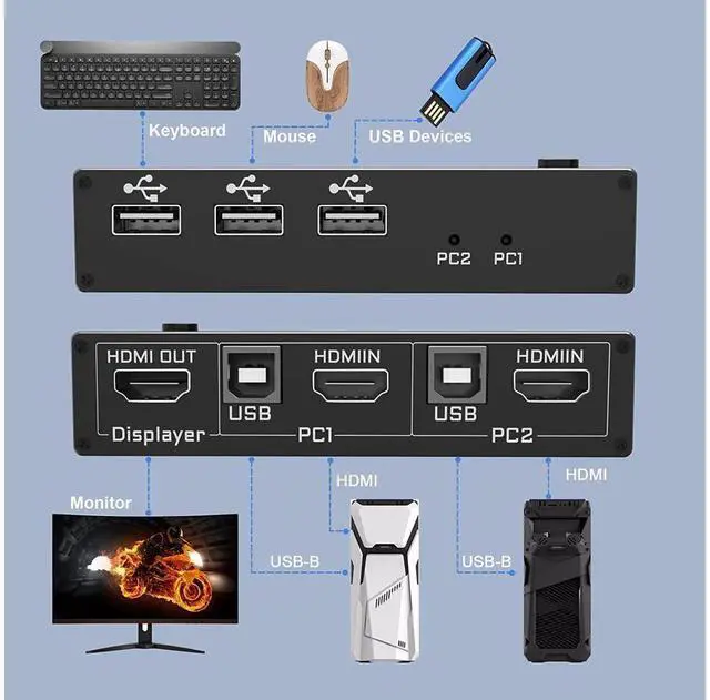 [2 In 1 Out] The HDMI KVM Switch 2 Port can 1 set keyboard and mouse control 2 PCs share 1 monitor, which can support wired/wireless/mechanical keyboard use.