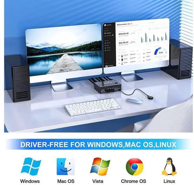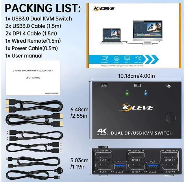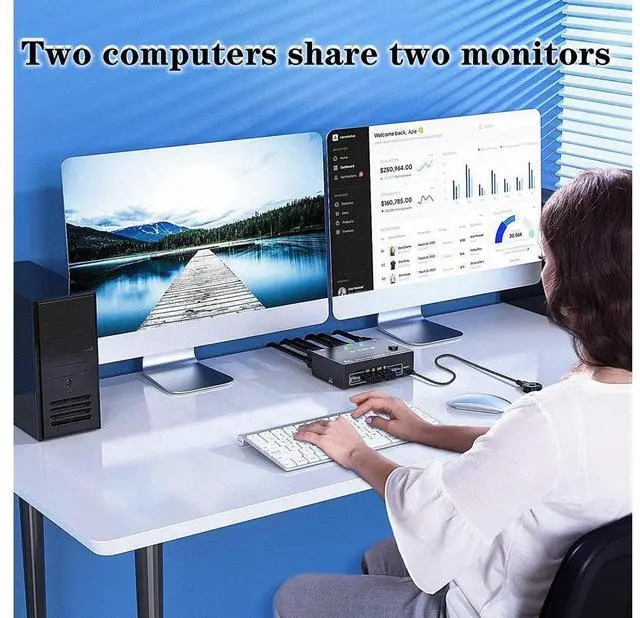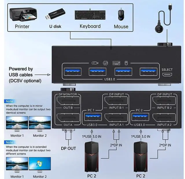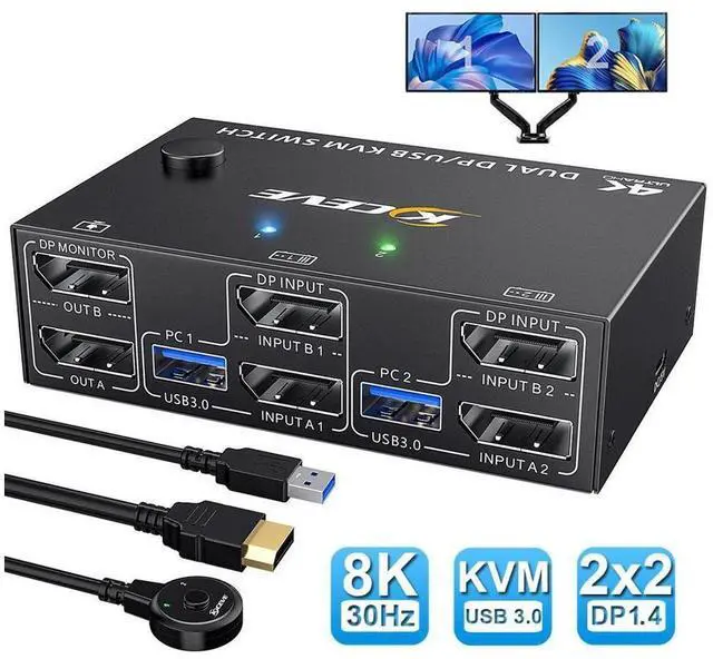 2 Ports Dual Monitor displayport KVM Switch, 2 computers share 2 monitors and 4 USB 3.0 devices.