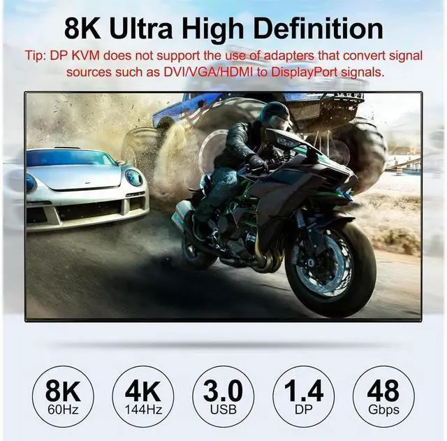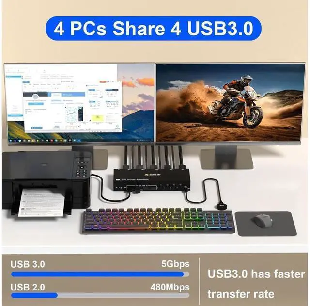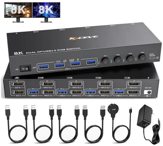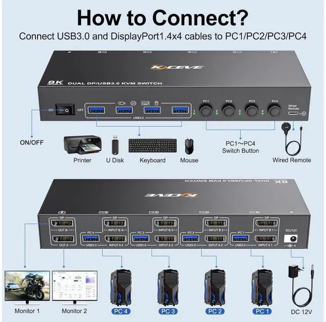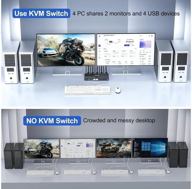 2, Dual monitor DP KVM switch for 4 computers to share 2 monitors. To make it work properly please connect all USB cables to give enough power.