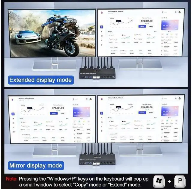 Dual monitor KVM switch, every computer must have 2 x DP output ports and support an extended display.