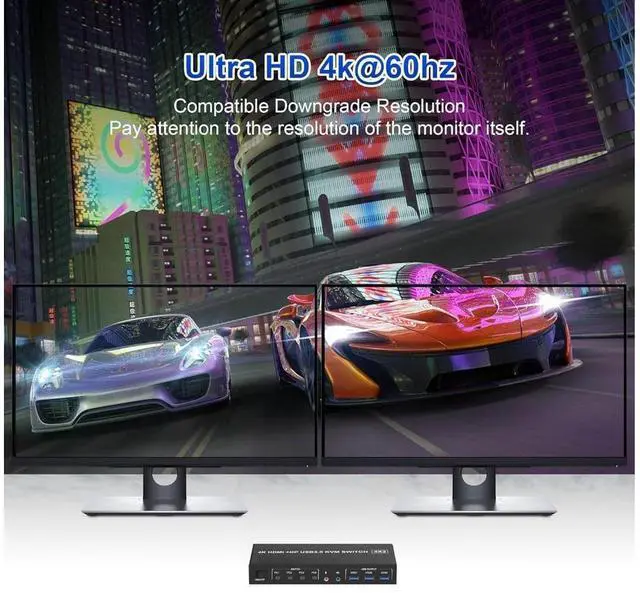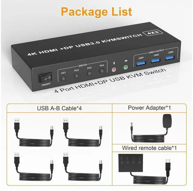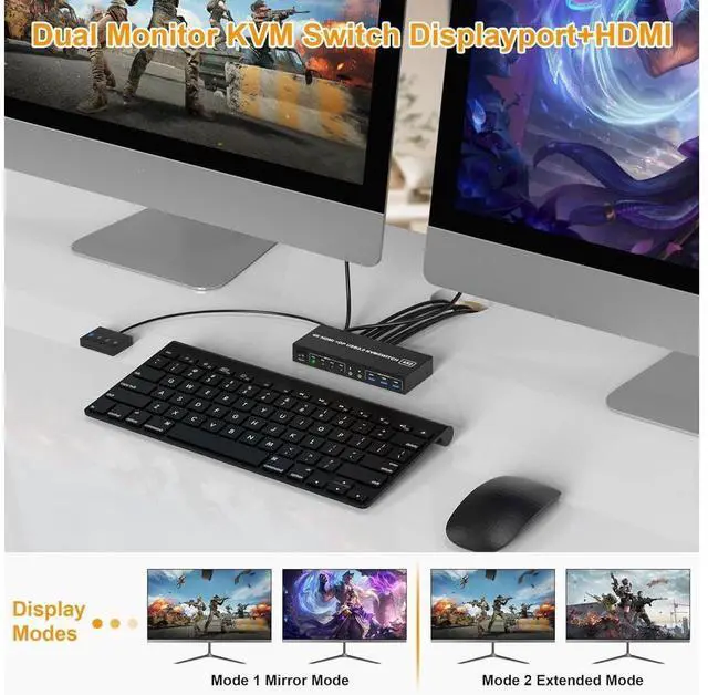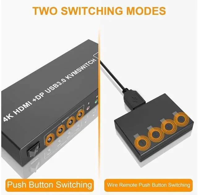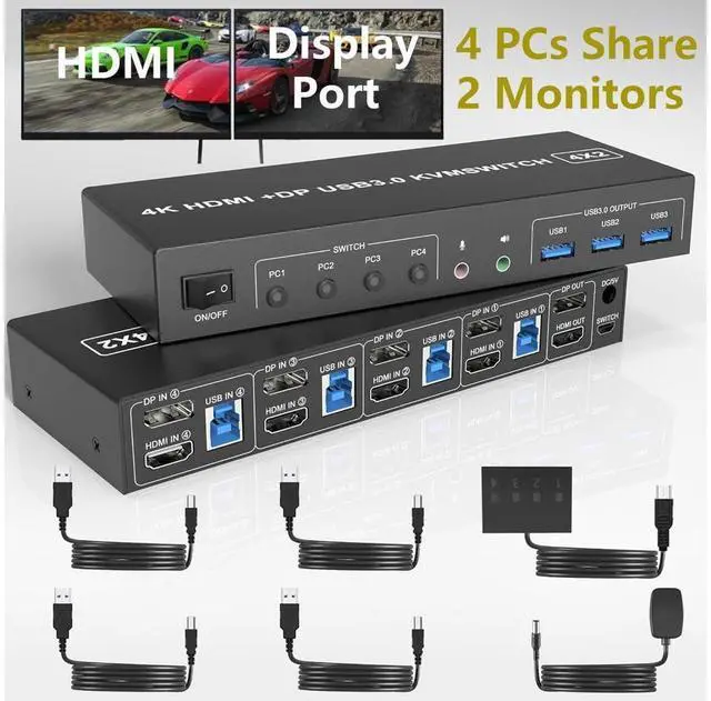 USB 3.0 Dual Monitor 4 Port (DP+ HDMI ) KVM Switch 4K@60Hz-4 computers share 2 monitors and 3 USB 3.0 devices.