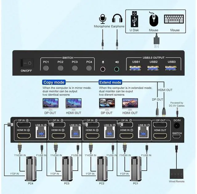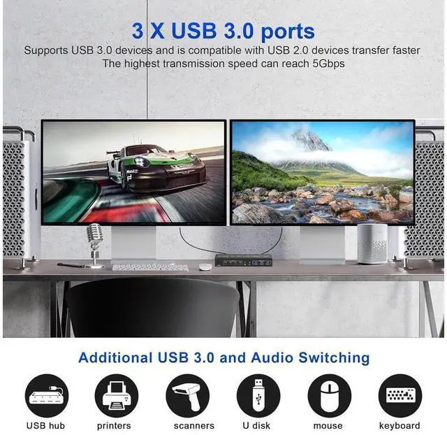 4 computers/laptops share one set of keyboard, mouse and dual monitors, and more USB 3.0 peripherals;