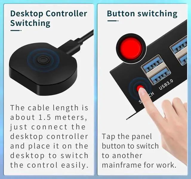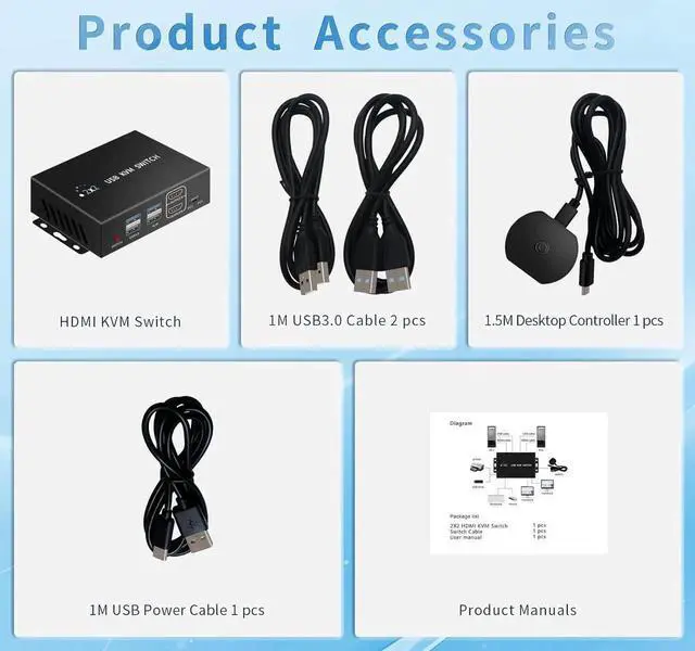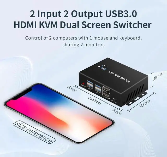 The HDMI KVM Switch supports 1 computer connected to 2 monitors, duplicate mode: displaying the same screen; extended mode: displaying different screens; and sharing a set of USB devices and a mouse and keyboard.