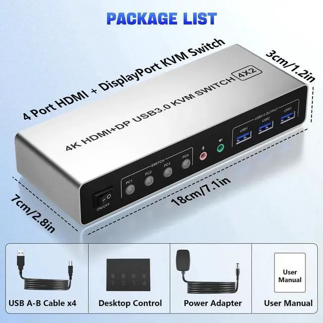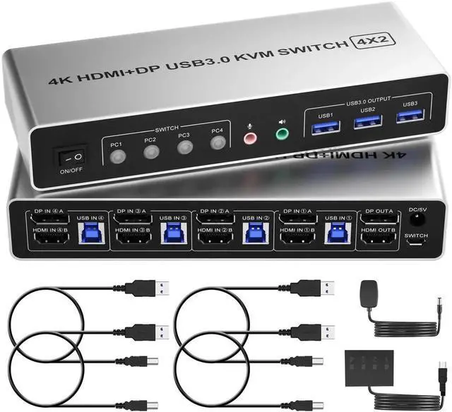 4 Port USB 3.0 HDMI DisplayPort Dual Monitor KVM Switch: This HDMI DisplayPort dual monitor KVM Switch allows you to control 4 computers or laptops with one set of keyboard, mouse, and single or dual monitors to make your workspace tidy and efficient, also a premium choice for working from home. Note: This dual monitor KVM supports HDMI + DP dual-screen display (This function requires your PC to support dual display or multi-display, then you can use this KVM to achieve 4 PCs to share 2 monitors)
