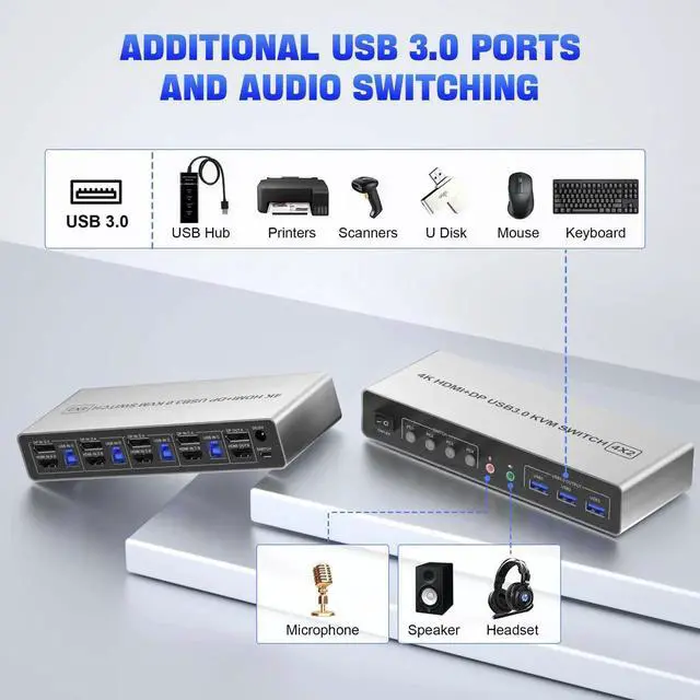 3 USB 3.0 and Audio Microphone Ports: This dual monitor KVM HDMI switcher with 3 USB 3.0 ports which can recognize keyboard mouse, U-disk, printer, or other USB devices. USB 3.0 has a faster data transfer speed of up to 5Gbps, backward compatible with USB 2.0/1.1 devices while USB 2.0 has a data transfer speed of 480Mbps. Come with a 3.5mm Audio Jack port with a DAC chip inside and a 3.5mm microphone interface, which can be inserted into a 3-segment 3.5mm earpiece device and microphone.