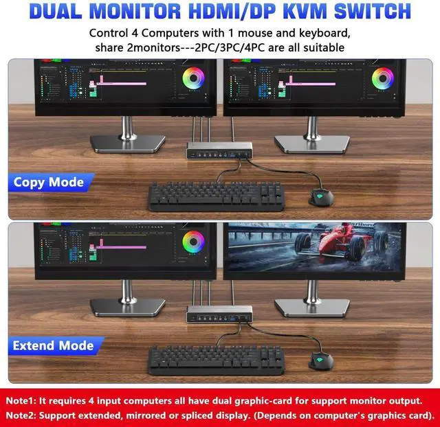 Ultra HD 4K@60Hz Dual Monitor KVM Switch: This dual monitor 4 port kvm switch supporting high resolution max up to 4K@60Hz, and also supports 3D and 1080P@60Hz or other lower resolution (Downward Compatible). Support up to 4K@60Hz for extended and mirrored display. Note: Only when both your computer Graphics card, monitor and DP/HDMI cable support 4K@60Hz then you can get 4K@60Hz effect, so if you want the max resolution you have to check your devices first.