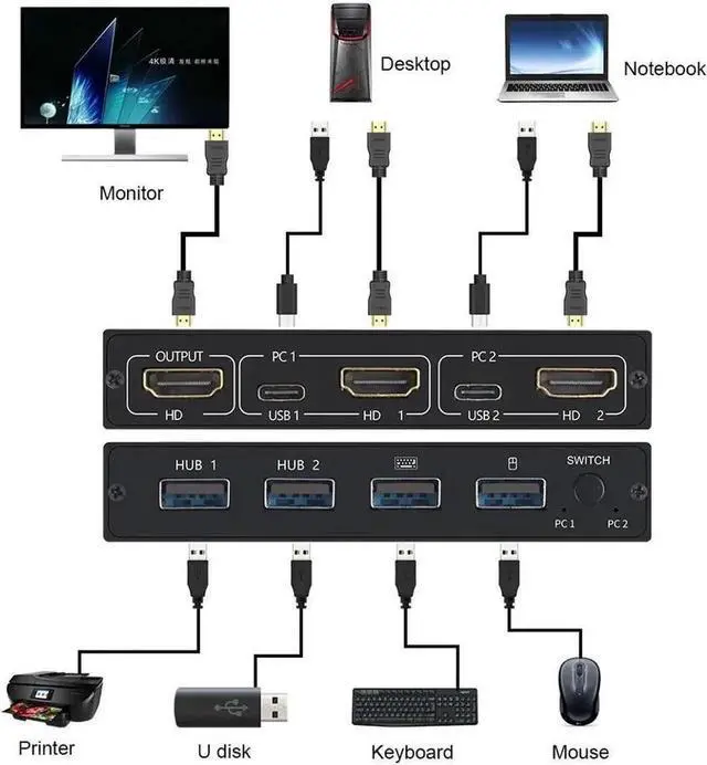 (2) the two devices share a printer, U disk, hard disk and other devices. The product supports 4K60Hz high-definition output, and has a wide range of application scenarios (such as office switching, video conferencing, multi teaching, securities finance, etc. ), which can save office costs, convenient operation, plug and play.