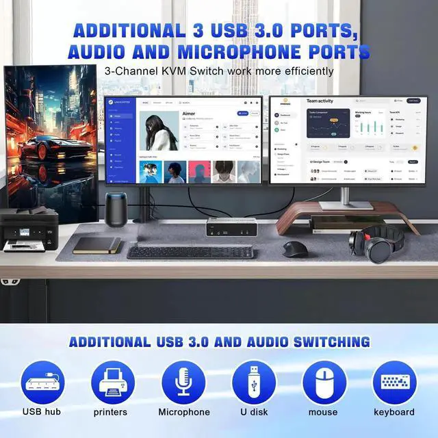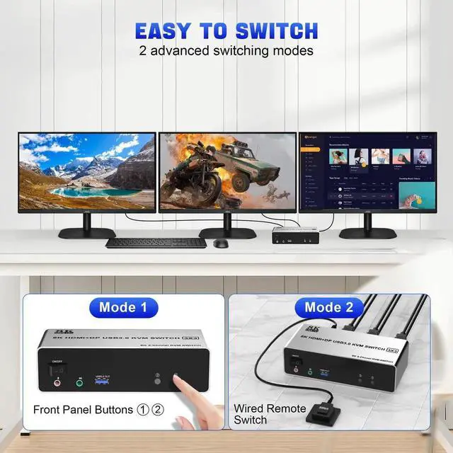 8K@60Hz HDMI + 2 DisplayPort KVM Switch 3 Monitors 2 Computers Sharing 3 USB 3.0 Ports, Audio & Microphone, Keyboard & Mouse