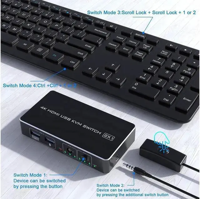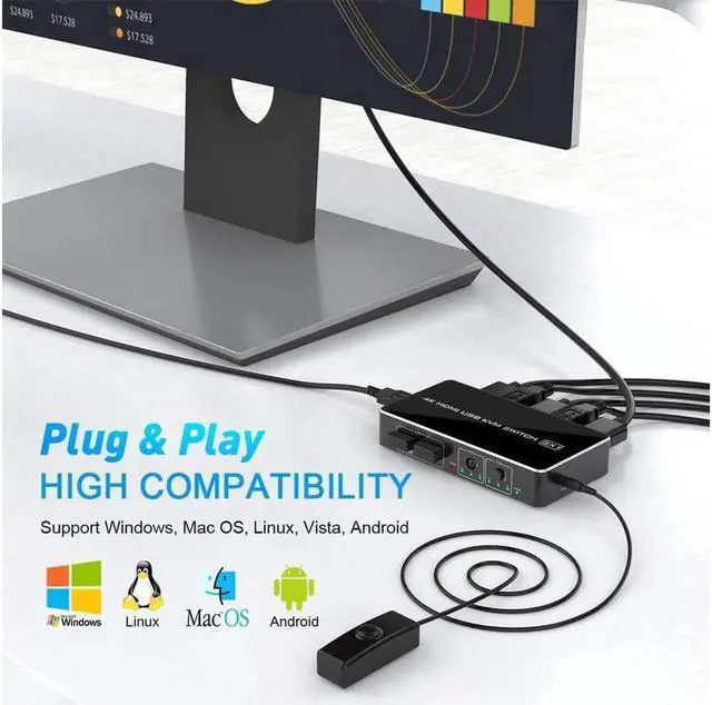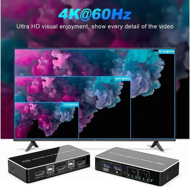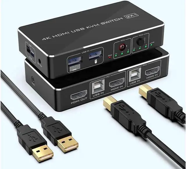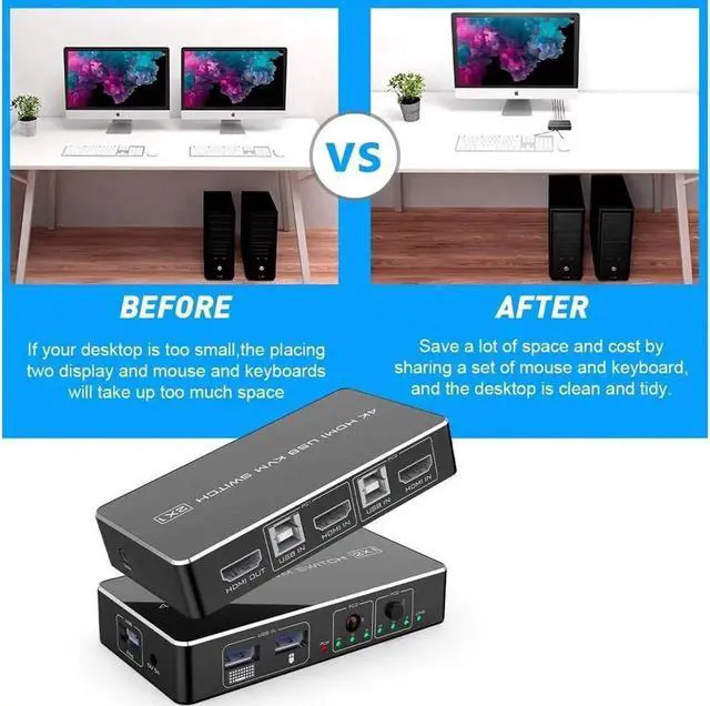 (Note: if you want this KVM support 4Kx2K@30Hz, please confirm all your devices are support this high resolution).??? 2 USB 2.0 Hubs & Wireless Device?? Kvm Switch Box supports Connecting your usb 2.0 port device. With 2 USB 2.0 Hubs so that 2 pcs can share more USB 2.0 devices, such as printer, U-disk, scanner, wireless keyboard and mouse and mechanical gaming keyboard. It will be a good choice for Enterprise, Office, Multimedia Teaching, Meeting Room, Gaming Room, Home Theater, Research Test, etc.??? Powered By USB and Hot Key Switch?? USB Switch Adapter support plug and play, Can be switched Using the extended switch button with cable, or KVM switch host button, which is convenient and quick. Powered by USB-B cables, it will provide enough power to the device. No power adapter required, saving your space.??? Widly & Smart Compatibility?? The high compatibility of this kit enable it identify and match various display devices automatically, such as PC, Laptop, TV, Xbox, video receivers and most of the HDMI capable devices.
