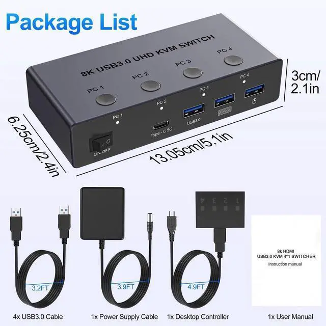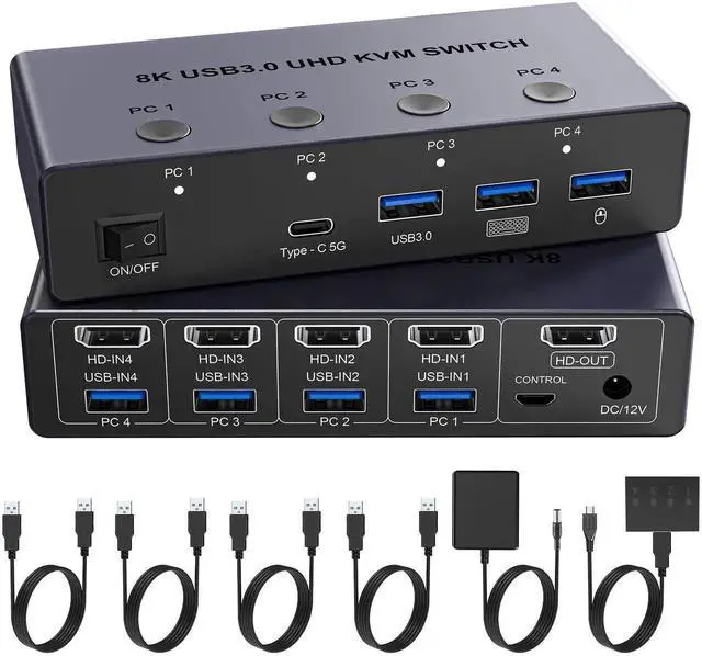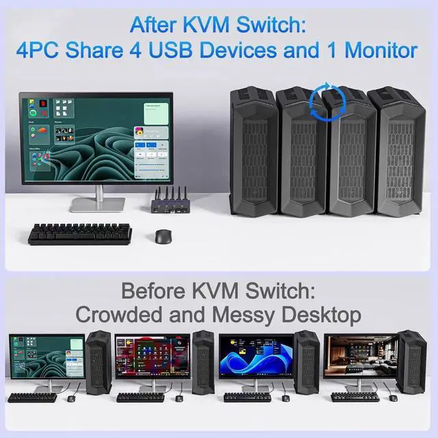 Additional Features- Two Switching Ways: HDMI KVM Switch supports One-Button switch or desktop controller switch, freely switch between 4 computers, saving space on your desk and sharing your display, keyboard and mouse between four computers. LED indicators clearly show which computer is active. The wired desktop controller allows you to place the HDMI 2.1 KVM switch out of sight for a cleaner, more organized workspace. NOTE: Not support Hotkey switching