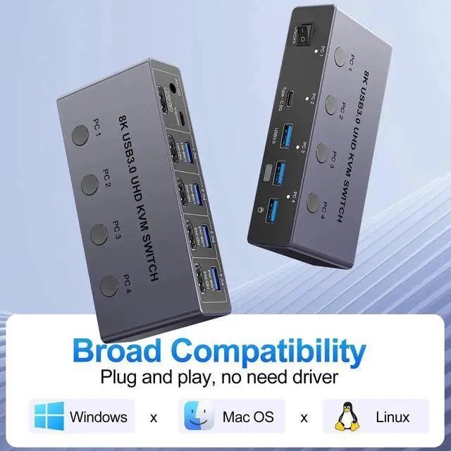 - Wide Compatibility & Driver-Free: This USB switch supports Windows, MacOS, and Linux systems. Just plug and play. It is compatible with most HDMI source devices, such as PC, Laptop, MacBook Pro, Mac mini, Nintendo Switch, PS5, PS4, PS3, Xbox One, etc. Our 8K 60Hz KVM switch is widely applied for enterprise, office, multimedia teaching, meeting rooms, gaming rooms, research tests, etc