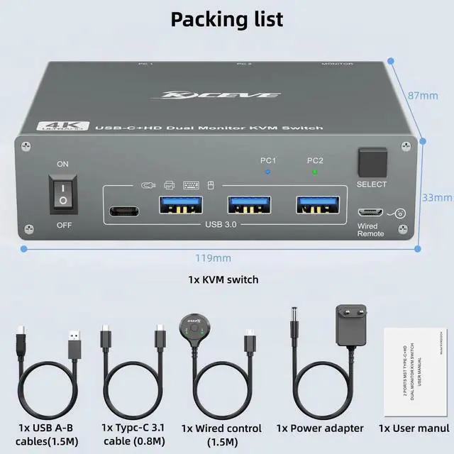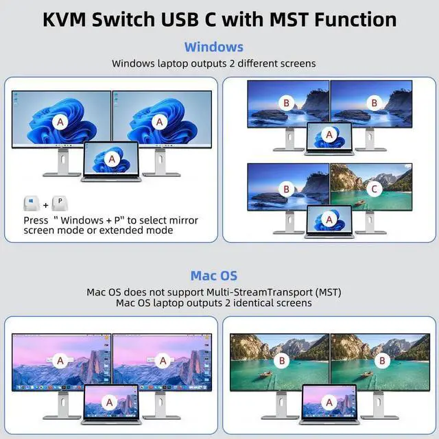 - [ Plug and play]Plug and play, drive-free, this USB-C 2 monitors KVM switch widely used in many occasions, such as office, conference, teaching, performance, live broadcast, home theater, etc. It will be our great honer if you purchase the kvm switch from us, we provide one year professional warranty, please feel free to contact with us if you have any questions.
