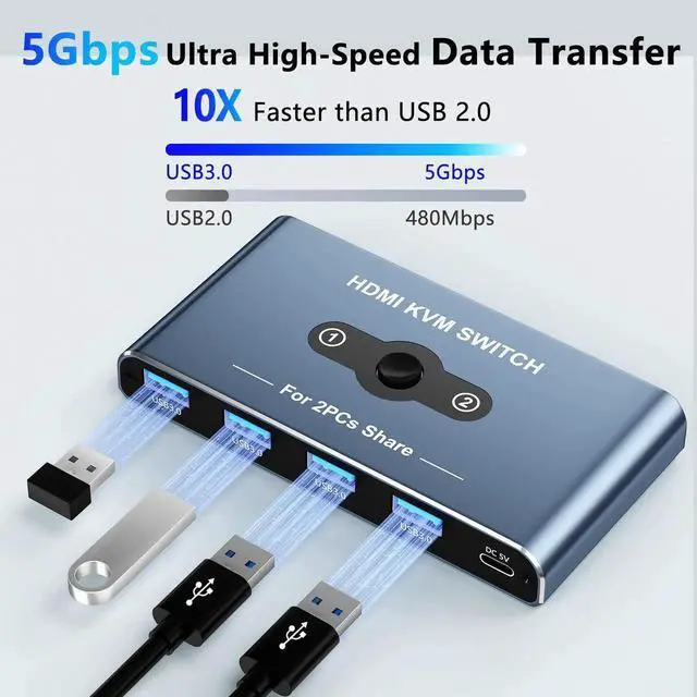 Additional Features- [High-Speed USB 3.0 Ports]Equipped with 4 USB 3.0 ports, our KVM switch supports ultra-fast data transfer rates up to 5Gbps, perfect for connecting peripherals like mice, keyboards, printers, webcams, and USB sticks. It is also backward compatible with USB 2.0, 1.1, and 1.0, ensuring versatile connectivity for all your devices.