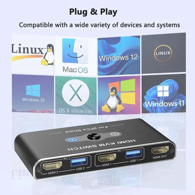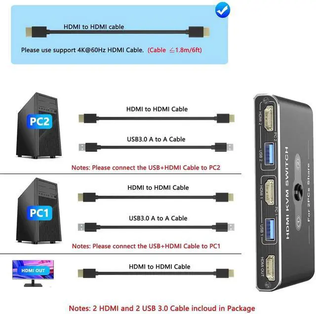 - [No Worry to Buy]The KVM Switch 1 Monitors 2 Computers comes with 12 months after-sales service and 24 hour online technical support. If the HDMI KVM does not work properly for your computer, please feel free to contact us at any time. Package Content: 2* USB 3.0 Cable, 2*HDMI 2.0 Cable, 1* USB-C Power Cable, 1* User Manual.
