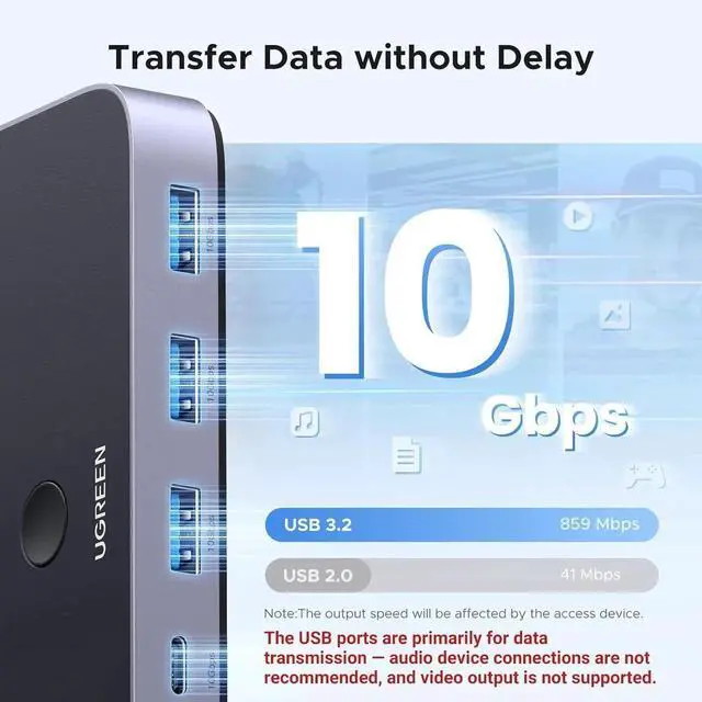 10Gbps Transfer Speed: The USB-C switch is equipped with 4 USB 3.2 Gen 2 ports and speeds up to 10Gbps. Faster than traditional 5gbps USB Switches, Transfer 1 GB files in 1.5 second to improve work efficiency without waiting.(The USB ports are primarily for data transmission audio device connections are not recommended)