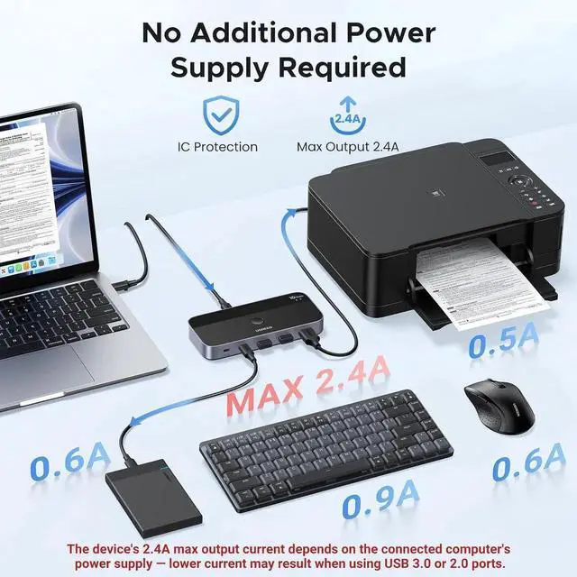Performance Upgrade: Simple Plug and play and enough to drive most devices without additional power. The MAX power output is 2.4A, support switch work with keyboard, mouse, printer and hard driver without power supply.(Max output current depends on the connected computer's power supply lower current may result when using USB 3.0 or 2.0 ports.)