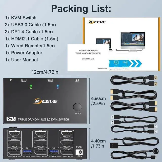 | Package Content: | 1x KVM Switch, 2x DP Cable, 1x HDMICable, 2xUSB Cable, 1x Power Adapter,1x Wired Remote,1x Manual |