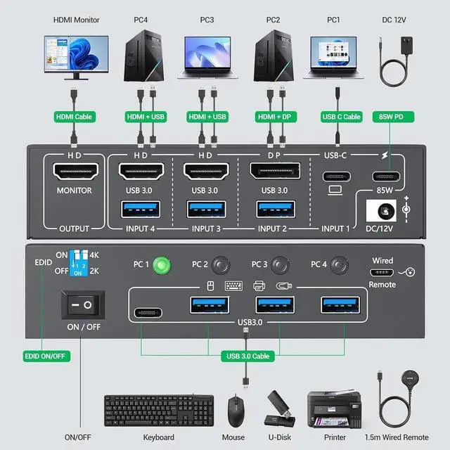 4 inputs 1 output KVM switcher support many kinds of input devices,such as desktop, laptop, Internet TV box, DVD, Xbox One, TV Box, PS5, has 1 USB C +1 DP+2 HDMI port.