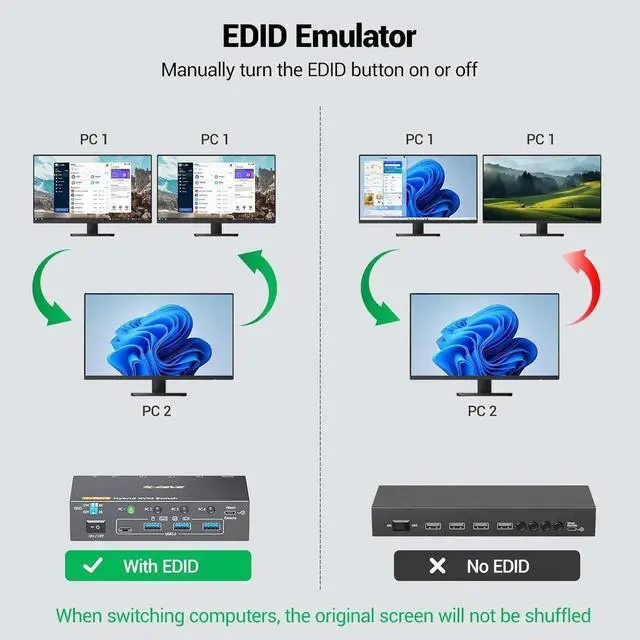 Pressing button or via the 1.5m wired remote controller to freely switch between 4 input sources. LED lights indicate which computer is active