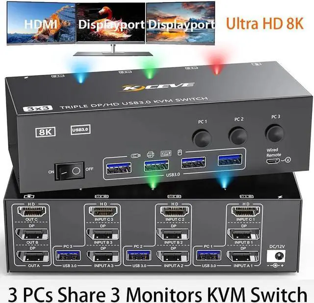 This 2 Displayport+HDMI triple monitor KVM switch is perfect for 3 computers or laptops to share 3 monitors and 4 USB 3.0 devices (keyboard, mouse, printer, scanner and other USB devices.