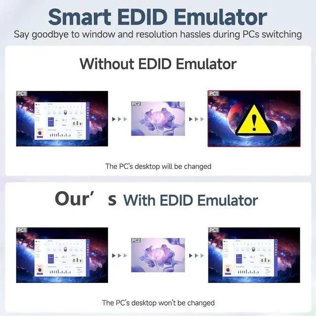 Note: Please make sure computers support 8K resolution and plug in HDMI 2.1 cable. This KVM switch also works with Ultrawide monitors.