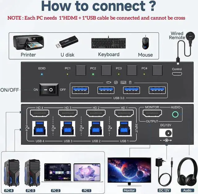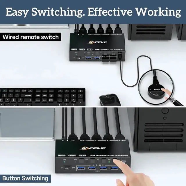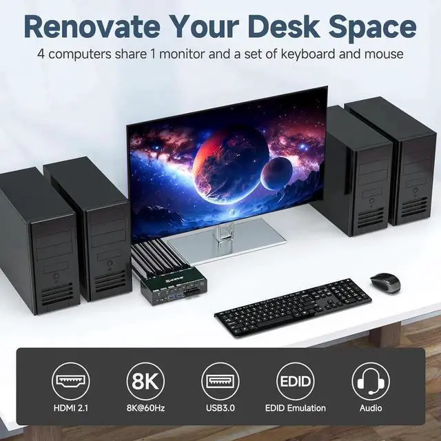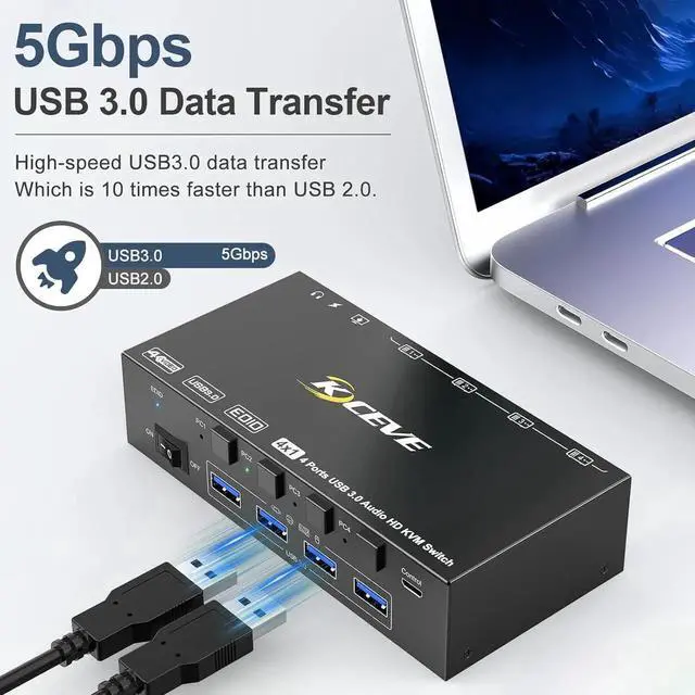 With this 4-port HDMI KVM switch, you can control 4 computers with just one set of monitor mouse keyboard. You can easily switch between four computers on one monitor and share four USB 3.0 devices.