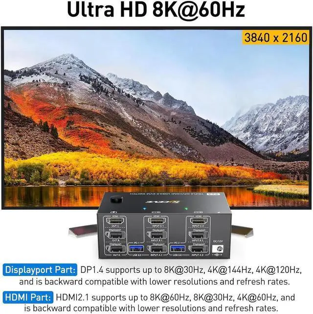 [UHD8K@60Hz/4K@144Hz] The resolution and fresh rate of triple monitor KVM switch supports up to 8K@60Hz/4K@144Hz. BUT PLEASE NOTE THAT: 1)HD-MI supports 8K@60Hz,4K@60Hz,and backward compatible.2)Displayport support 8K@30Hz ,4K@144Hz and backward compatible.