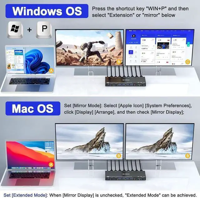 2 monitors output support up to 8K@30Hz for extended, support HDMI 2.0 and DP 1.4 standards. Extended, Mirrored or spliced display(Depends on your computer's graphics card. );
