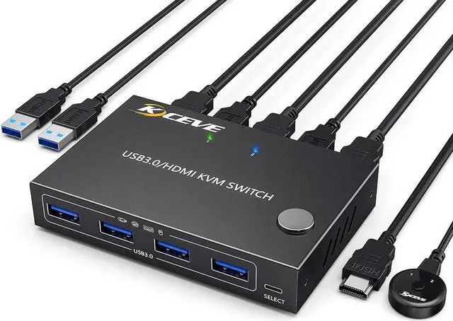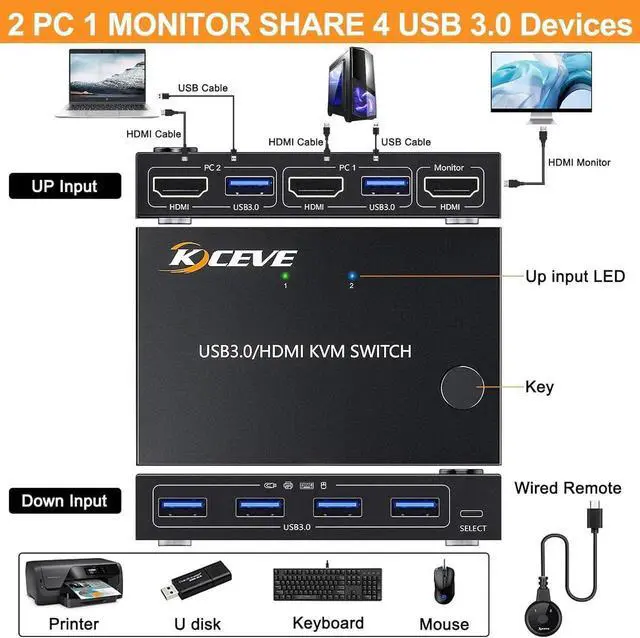 The 2 ports HDMI KVM switch has 4 USB 3.0 ports (for connecting USB devices such as cameras, printers, USB flash drives, mice, keyboards, etc. ) and supports fast USB 3.0 data transfer with data transfer speeds up to 5Gbps and is backward compatible with USB 2.0.