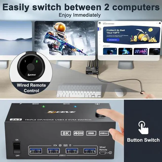 ![Alt view image 2 of 7 - Triple Monitor 2 Displayport + HDMI KVM Switch 8K@60Hz 4K@144Hz, [HDMI + 2 Displayport] KVM Switch for 2 Computers Share 3 Monitors and 4 USB 3.0 Device, with Wired Remote and 5 Cables](https://c1.neweggimages.com/productimage/nb640/C601S26041407STANA9.jpg)