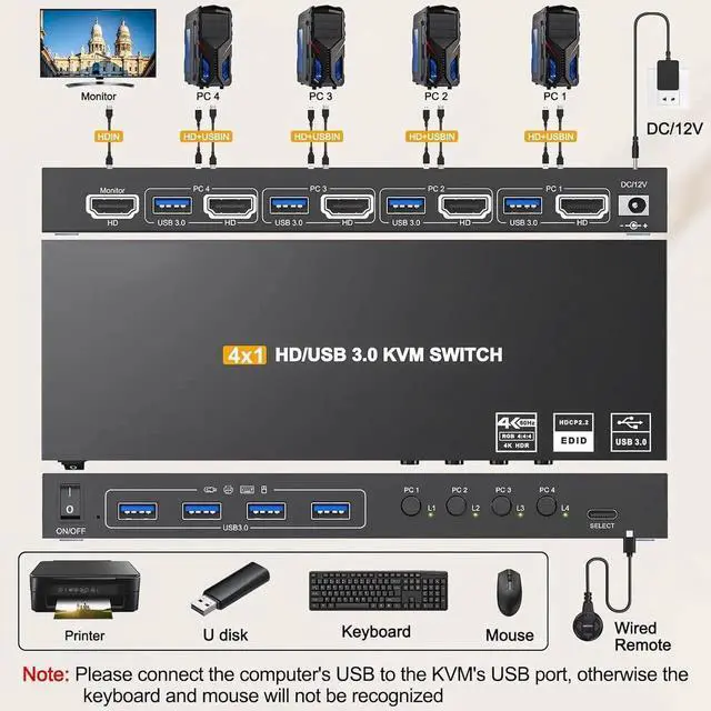 AUTYUE USB 3.0 KVM Switch HDMI 4K@60Hz/2K@120Hz, with EDID, 4 Port HDMI KVM Switch for 4 Computer Share 1 Monitor and 4 USB 3.0 Devices, Wired Remote and USB Cables Included giyqxHw