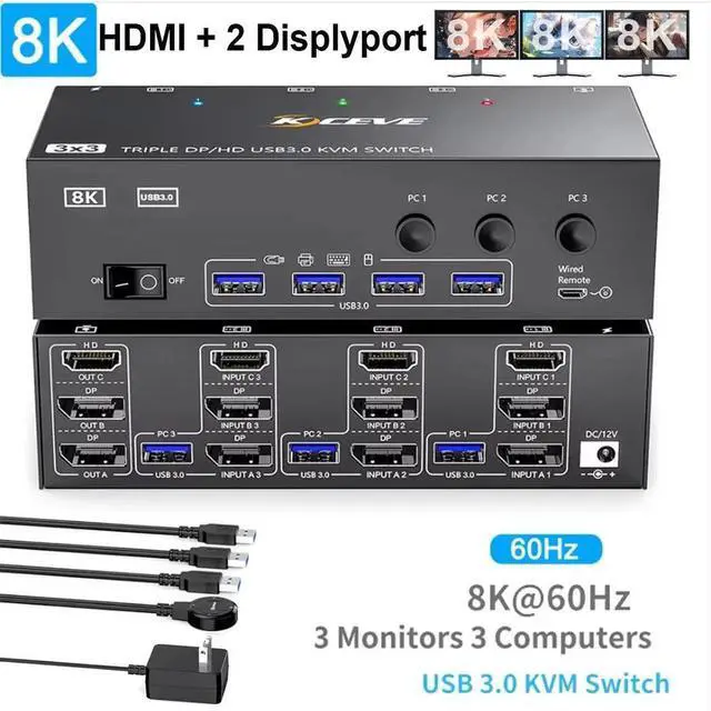 [HDMI + 2 Displayport Triple Monitor KVM Switch 3PC] The KVM Switch allows 3 computers to share 3 monitors and 4 USB3.0 ports(keyboard,mouse and other usb devices).Note:Only when your computer supports 3 display or multi display, you can use this KVM to achieve 3 PC to share 3 monitors.