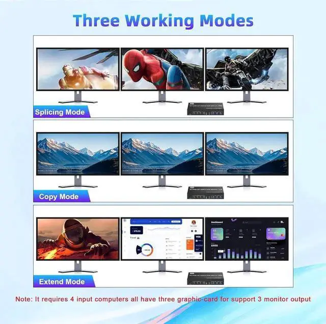 1. 8K Triple Monitor KVM Switch 4-Port allows 4 computers/laptops share one set of keyboard, mouse, and 3 monitors (2 HDMI + 1 DisplayPort)