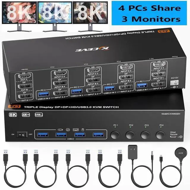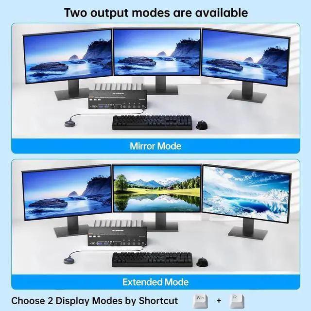 This KVM Switch supports multi-screen display, you can choose between Mirror Mode or Extended Mode for the three monitors as needed. In Mirror Mode, all three screens display identical content, while Extended Mode enables each screen to show different content.