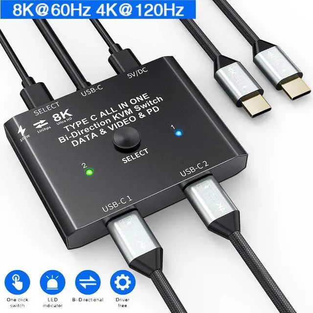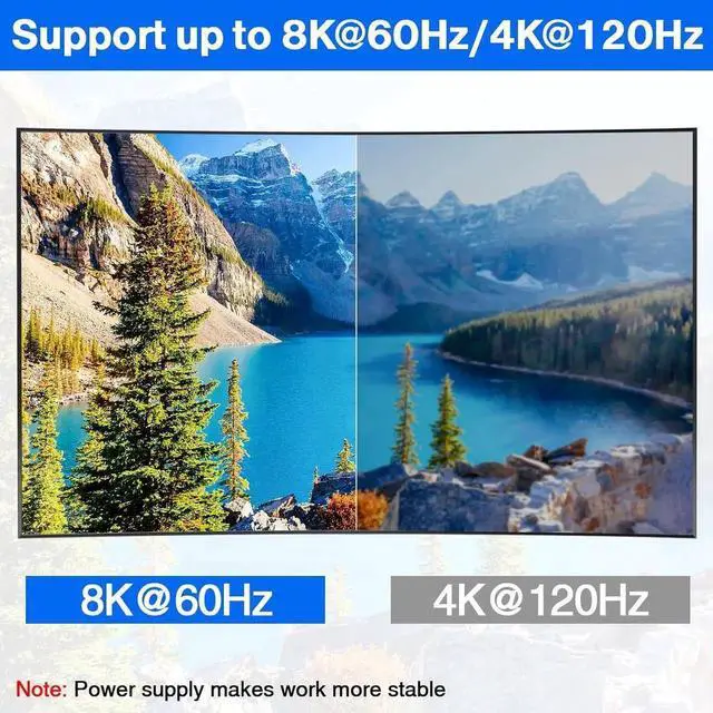 The USB C Switch support up to 8K@60Hz 4K@120Hz 1080P@165Hz via our USB C Switch/Splitter to your USB-C or HDMI Displays.. The Maximum resolution and refresh rate of your output depends on your Source device, monitor, USB C Dock, and cables.