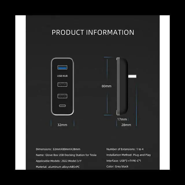 USB Hub 4 in 1 Docking Station Glove Box Splitter Extension Adapter Fast Charger Auto Accessories for Tesla Model 3/Y