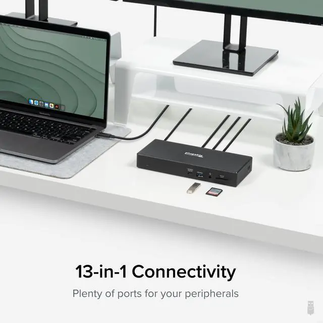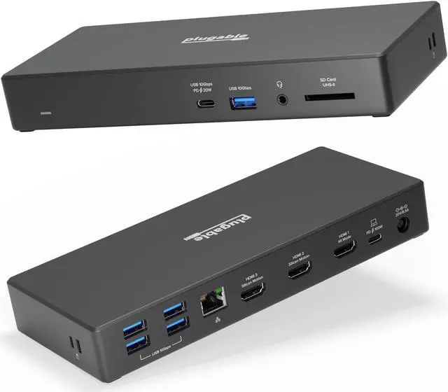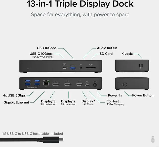 Docking station for laptop includes thirteen ports including 3x HDMI, 5x USB, 1x USB-C, Gigabit Ethernet, and SD reader.