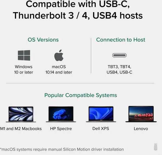 Windows 10 and newer, macOS 10.15+, and ChromeOS systems with USB-C, USB4, Thunderbolt 3 / 4. Silicon Motion driver download required.
