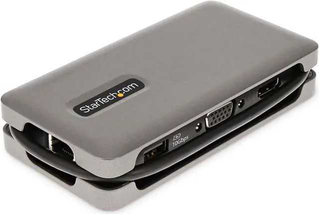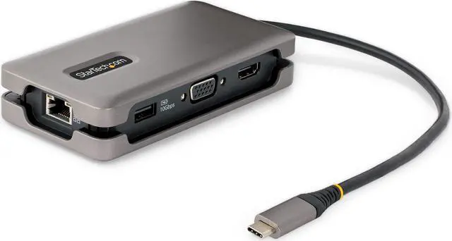 • Connect this USB Type-C Multiport Adapter to a USB-C, USB4, or Thunderbolt 3/4™ laptop to enable single-display 4K 60Hz HDMI 2.0b or 1080p 60Hz VGA video output via DP Alt Mode. The USB-C dock works with USB Type-C laptops or tablets, such as a Chromebook, Dell XPS, or MacBook. It features a 3-Port USB 3.2 Gen 2 (10Gbps) Hub (2x USB-A, 1x USB-C), and Gigabit Ethernet. Connect the laptop USB-C power supply to the dedicated USB Power Delivery (PD) 3.0 port, to charge the laptop.