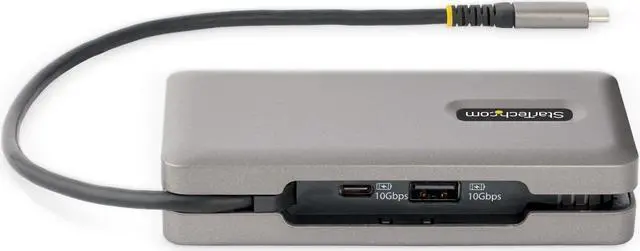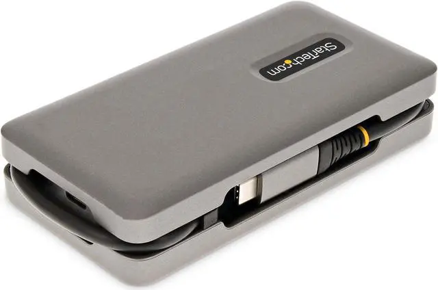 The Multiport Adapter features an extra-long attached 12.6in. (32cm) USB-C host cable. The Thermoplastic Elastomer (TPE) cable jacket is softer and more flexible than PVC jacketed cables. The extra-long cable reduces port/connector strain, particularly when laptops are placed on riser stands, or on 2-in-1 devices with raised USB-C ports, such as the Microsoft Surface. In addition, the Multiport Adapter also features an innovative wrap-around cable manager that facilitates tangle-free storage in a laptop bag.