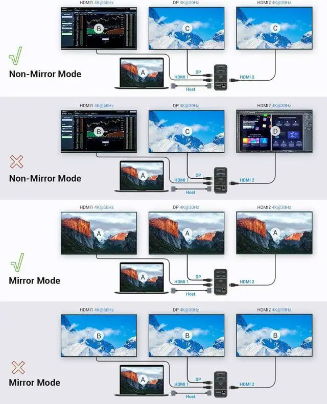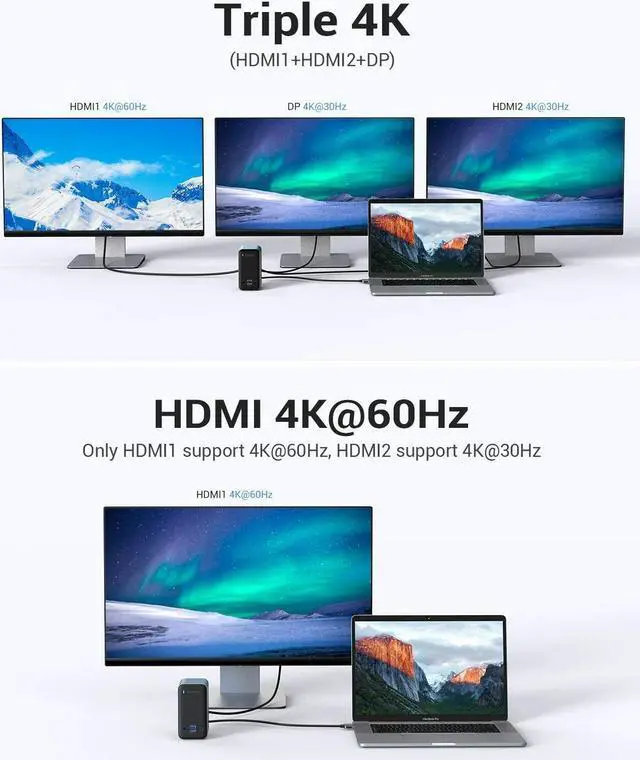 TripleHDDisplaysformacOS: Built-in HDMI and DP outputs supports triple monitors up to 4K@30Hz (3840×2160@30Hz) or single 4K@60Hz HDMI monitor when connected to displays that support the desired resolution. HDMI port supports resolutions up to 3840×2160@60Hz with a single HDMI display only. Easily setting mirror/extend/primary video mode, streaming 4K video to HDTV, monitors and projectors for the perfect visual display.