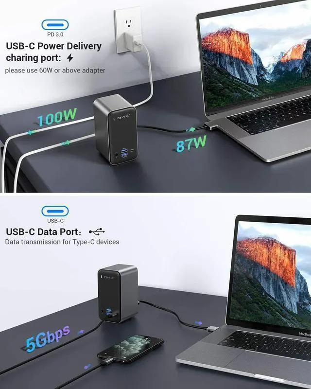 StrongUSB-CPowerDelivery: The OKX USB C Dock equipped with a USB-C port that supports 87W Power Delivery (PD 3.0 )for your USB-C laptop while connecting to a USB-C power adapter.