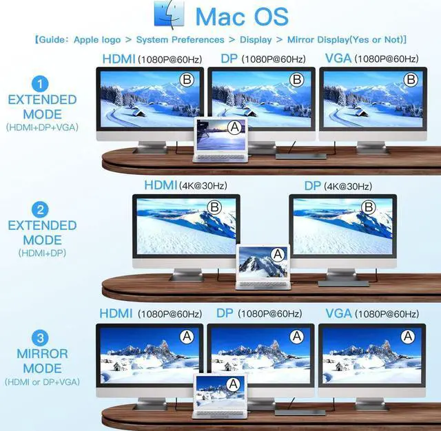 Triple Display DP+HDMI+VGA USB-C to 3 monitors. Support Displayport 3840x2160@30Hz, HDMI 3840x2160@30Hz, VGA 1920X1080@60Hz. Support extend mode and mirror mode in Windows system. Only supports mirrori mode in Mac OS system.