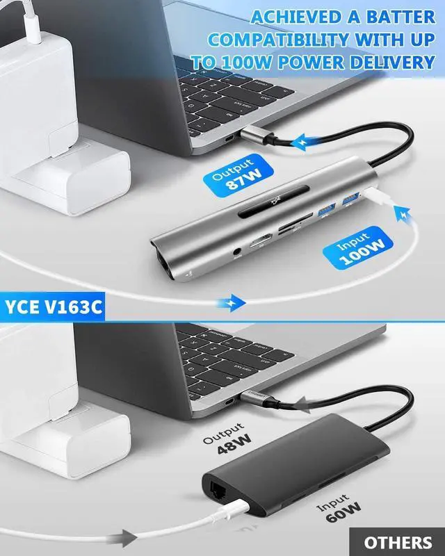 Superstrong Power Delivery: This multiport USB Type-C Docking Station supports PD charging up to 100WIt provides one Female port of Type-C pass through which you could securely charge while connecting multiple peripherals for data transferring,please notice when it is PD charging, our hub will heat up and lost a little power. It has a Beautifully crafted aluminium alloy shell to get a good heat dissipation effect.
