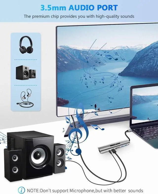 All in one multiport USB-C Dock: Expand your USB-C port to 4K HDMI and 1080P VGA video output, Fast Ethernet port, Micro SDTFand SD card reader, 3.5mm AUX Audio, USB 3.0/2.0 ports as well as one type C PD charging port.