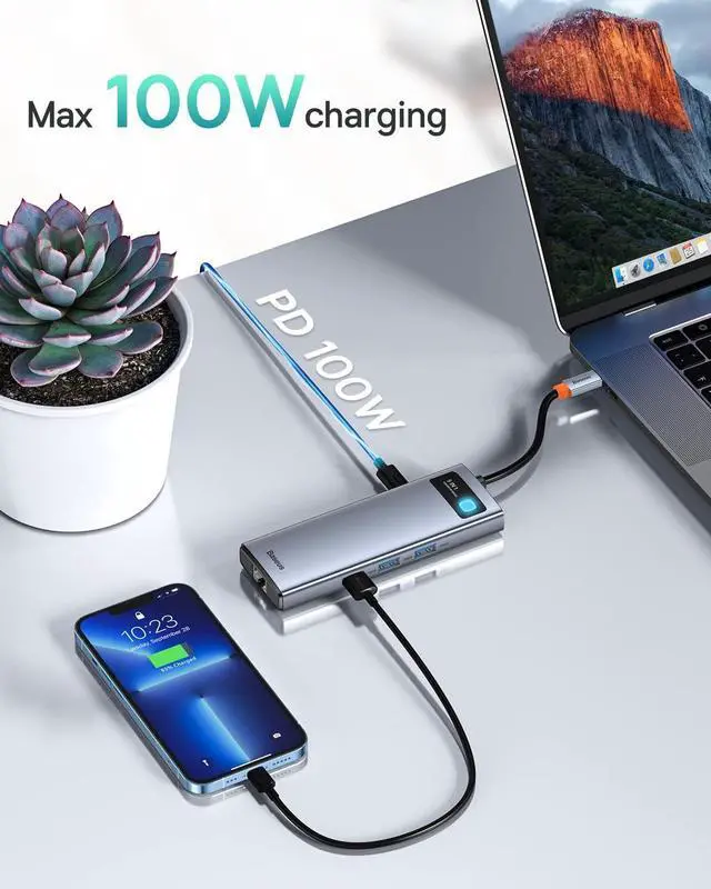 Fast 100W PD ChargingThe usb c multiport adapter provides one type-C charging port which could fast charge laptops while you're using all other functions of the hub. The usb c splitter supports a high-level of charging up to 100W, no need to worry about losing laptop's power when usb c docking station fully loaded.