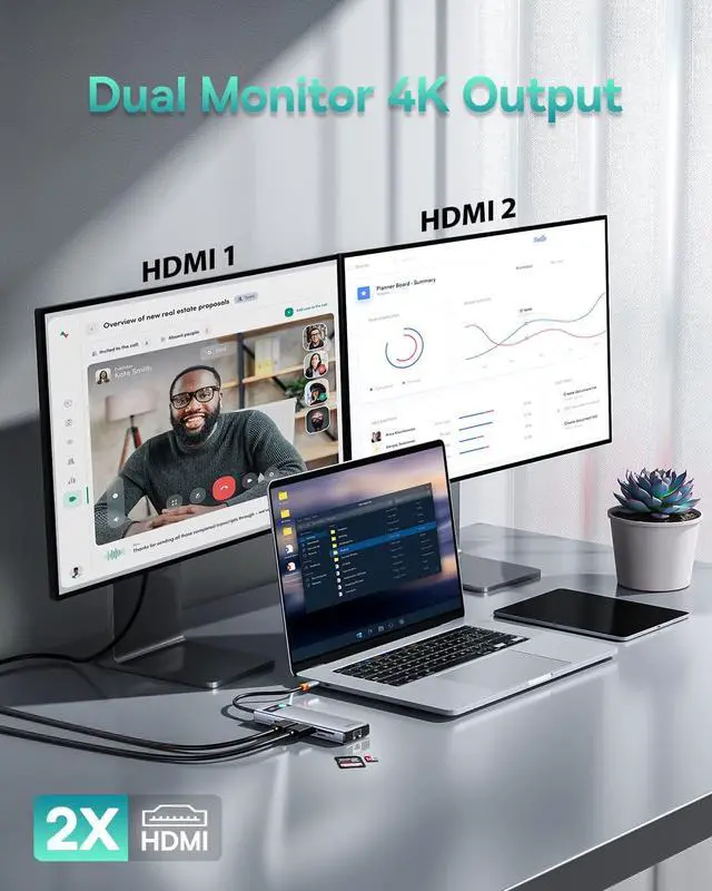 Advance USB C Card ReaderThe laptop docking station dual monitor with light and compact body also insert SD and TF slots. You can transfer photos in seconds to your laptop with highest speed up to 104MB/S and conveniently browse photos instantly on your USB-C smartphones/laptops. USB c dock is perfect for Photographer or Designer or Video editor,etc.